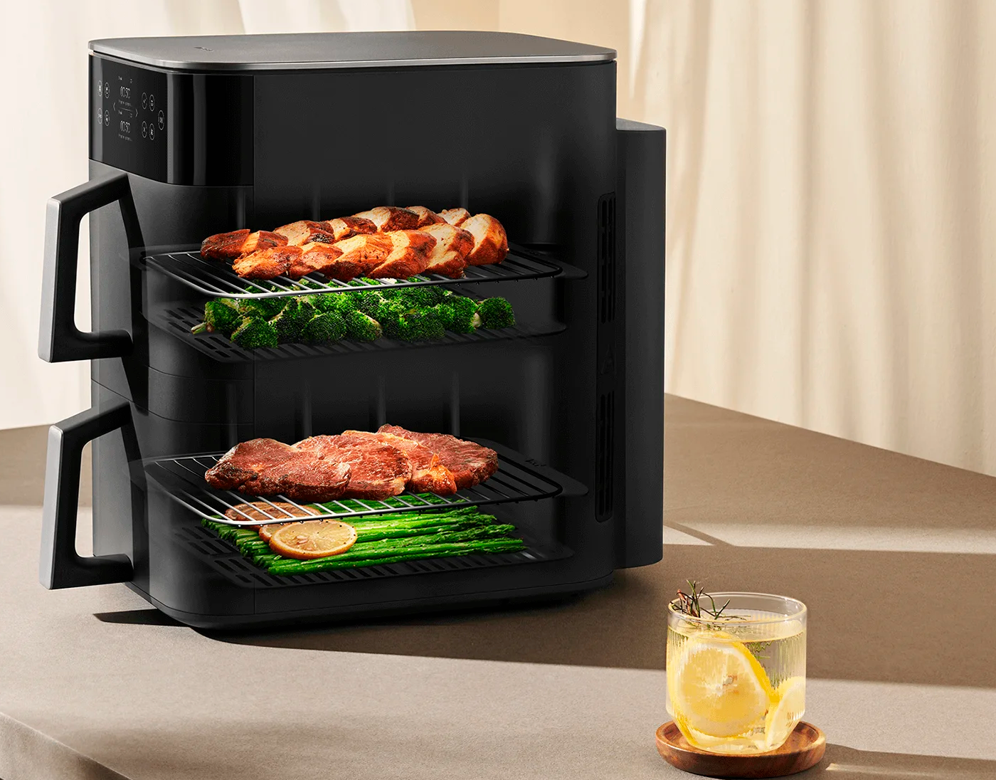 Xiaomi Smart Double Stack Air Fryer — вместительная аэрофритюрница с двумя корзинами и общим объемом 12 литров. Подходит для приготовления блюд на большую семью или для одновременной готовки разных продуктов.